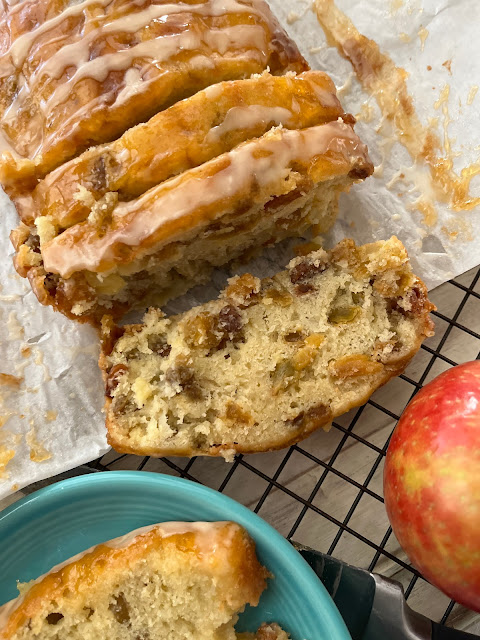 The cookbook author describes it as a moist apple and raisin-studded loaf, scented with rum and glazed twice.